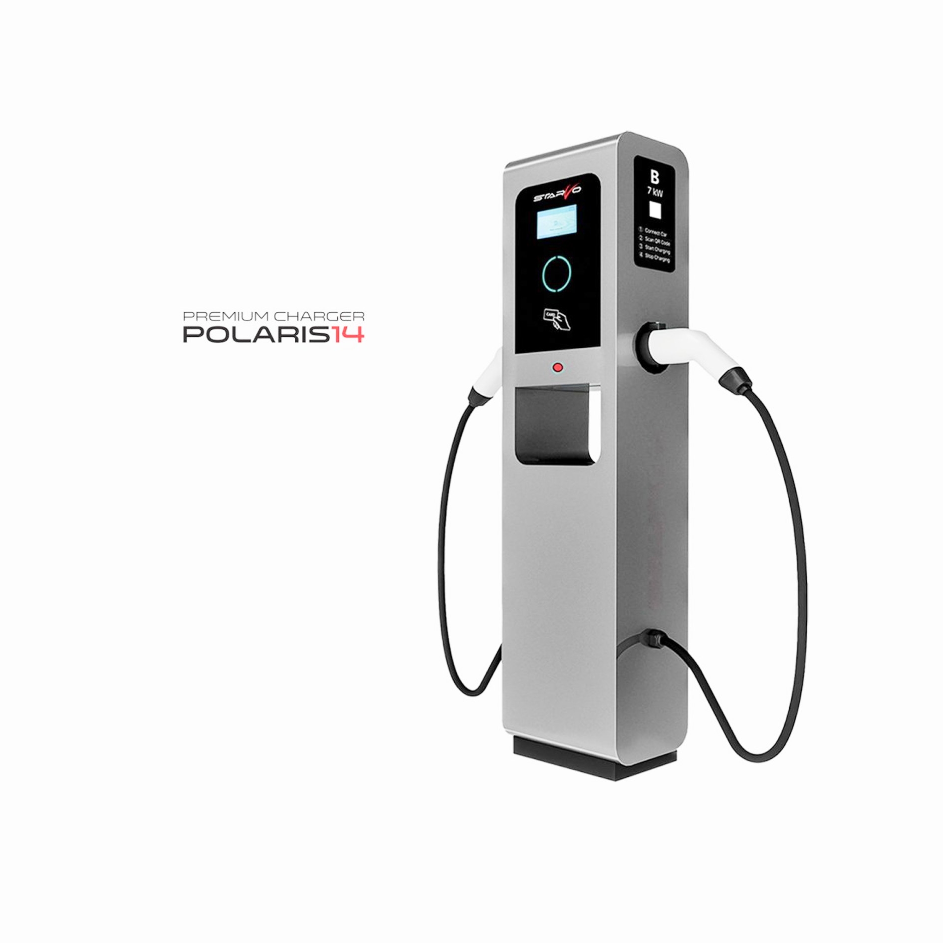 POLARIS 14 adalah premium EV charger dengan daya output total 14 kW (2 × 7 kW), dirancang untuk penggunaan publik maupun komersial. Mengusung desain modern dengan fitur lengkap, charger ini mampu memberikan performa stabil, aman, dan kompatibel dengan berbagai kendaraan listrik.